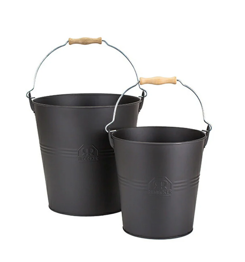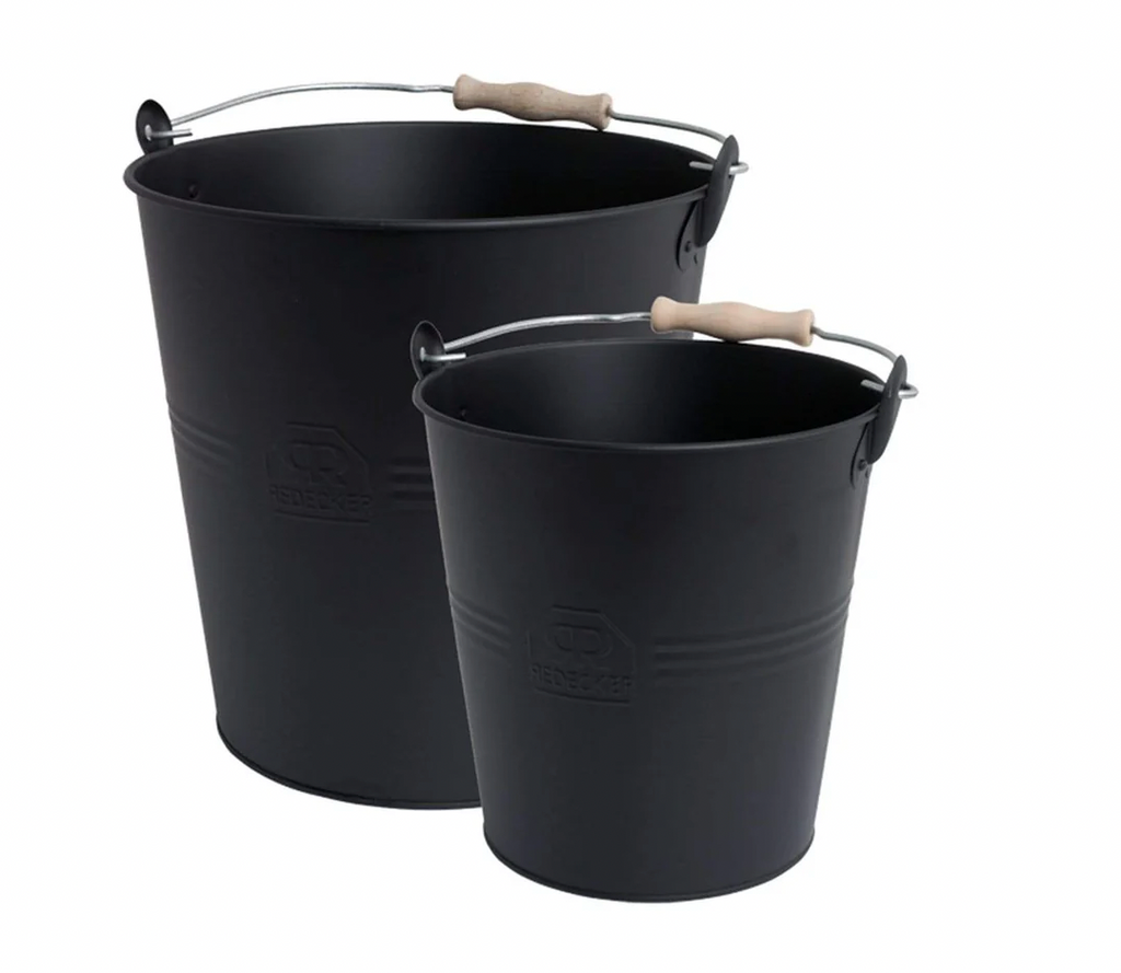 Redecker's galvanised metal buckets (set of 2) feature crafted wooden handles for ease of use. Expertly embossed with Redecker's logo, the large charcoal hued bucket stands 28cm tall and the smaller size is a handy 22cm tall. Functional yet great for storage and display.