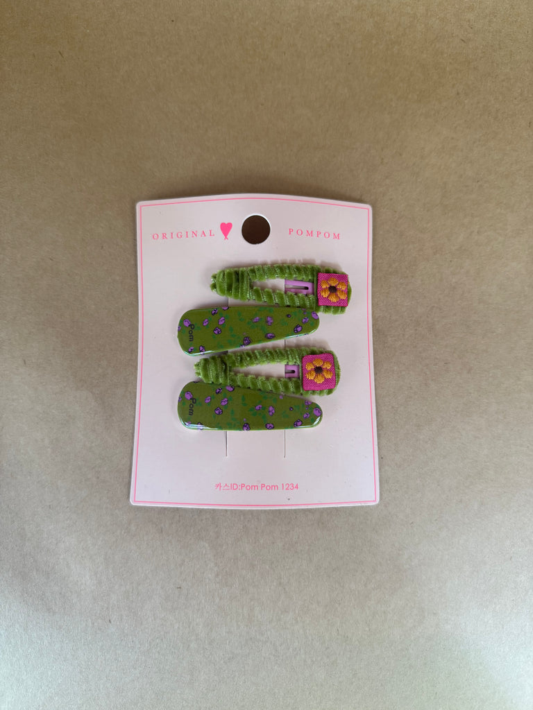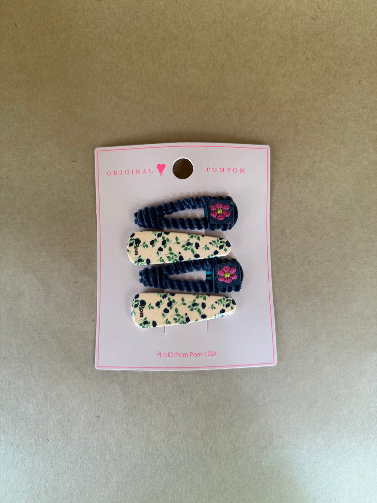 A set of hair clips of velvet and floral resin. Velvet cord with a flower pop and matching resin floral print clips that add a little colour to the everyday.